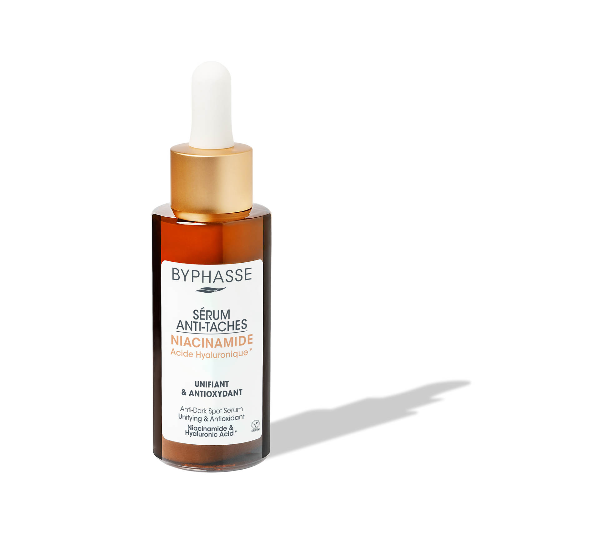 Byphasse anti-dark spot serum improves skin texture and prevents the appearance of new spots, while providing 24-hour hydration. It contains niacinamide and hyaluronic acid*, as well as provitamin B5 and vitamin E*. Formula with unifying and antioxidant properties. *Derivative of hyaluronic acid and vitamin E.