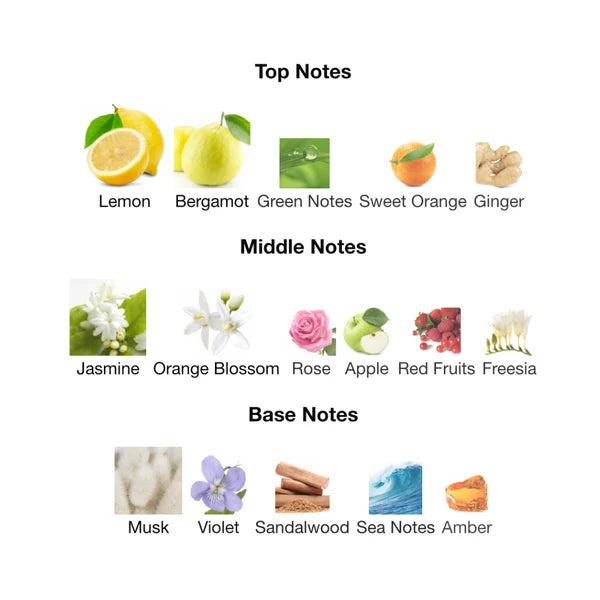 Top notes are Lemon, Bergamot, Green Notes, Sweet Orange and Ginger.